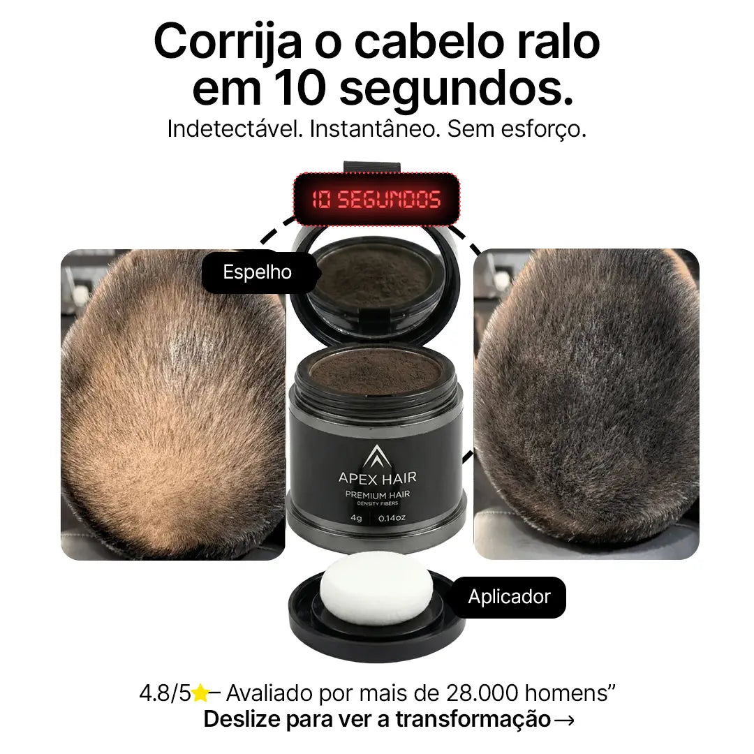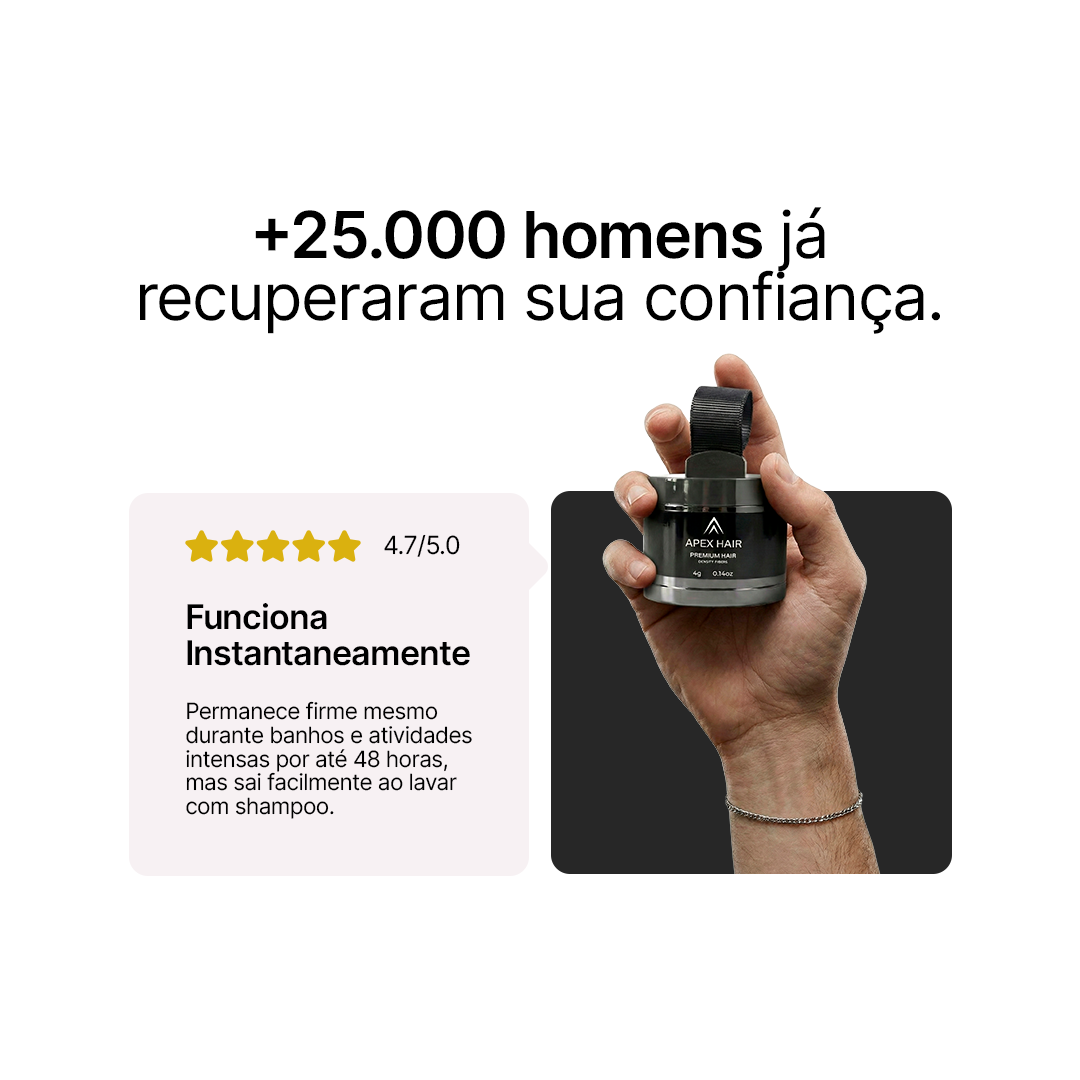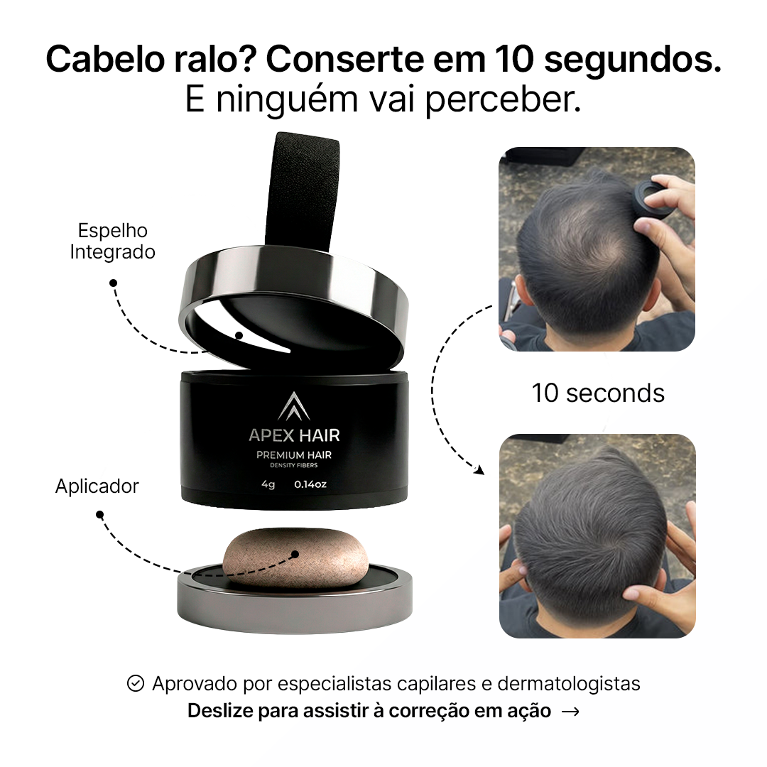 Perdeu olhares, sua auconfiança e sua verdadeira identidade. Sprays e fibras em pó falham! Só o Apex Hair usa a tecnologia que revolucionou o mercado com sua cobertura capilar